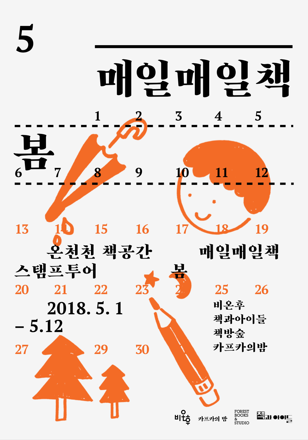 매일매일책봄은 동네 책방과 함께 봄을 즐기는 스탬프투어입니다. 2회를 맞은 올해는 온천천 및 수영구에 자리한 책방들이 의기투합, 여덟 곳의 책방이 당신을 기다립니다. 반가운 마음 담아 책방 스탬프 꾹꾹 찍어드려요. 공간별 특색 있는 도서 큐레이션과 다양한 행사로 꿀잼 보장, 완주 시 기념품 증정, 기본과 알파를 모두 갖춘 행사 ‘매일매일책봄’으로 나들이 오세요. 스쳐가듯 짧은 봄, 우리 지금 만나!
